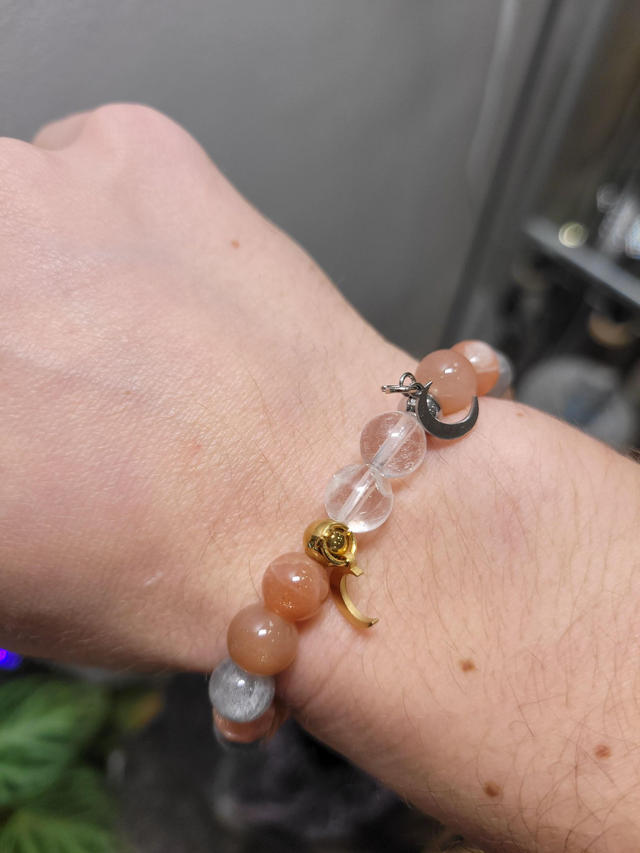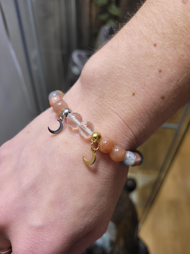 Porté au poignet, il invite à ralentir, à apaiser le mental et à faire confiance à son intuition. "Éclat lunaire" accompagne les moments où l’on cherche douceur, recentrage émotionnel, clarté intérieure et lien plus profond avec sa lumière sensible.