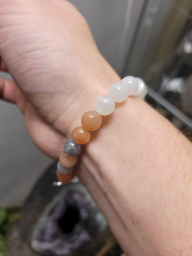 Dans la douceur argentée du soir, là où la lumière de la lune dépose un voile calme sur le monde, naît "Éclat lunaire" — un bracelet pensé comme une respiration douce. Ses pierres, choisies pour leurs reflets nacrés et leur énergie subtile, évoquent la sérénité, l’écoute intérieure et la connexion aux cycles naturels.