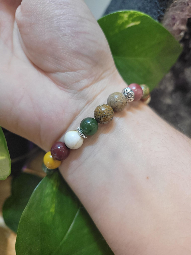 - Pierres naturelles : jaspe mokaïte, jade hétian, jaspe paysage, unakite