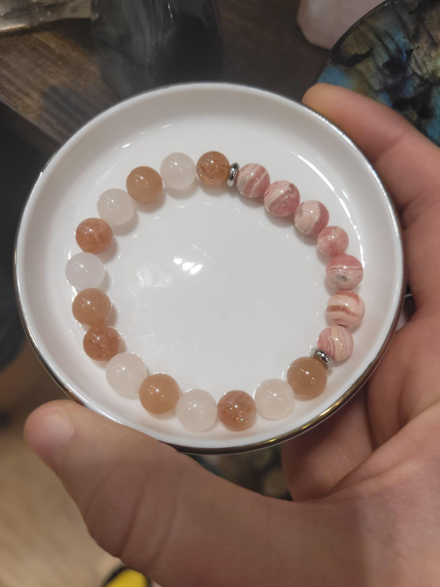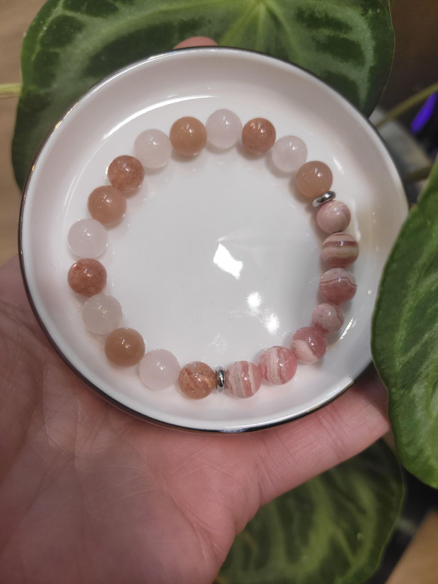 Pierres naturelles : quartz rose, rhodochrosite, pierre de soleil