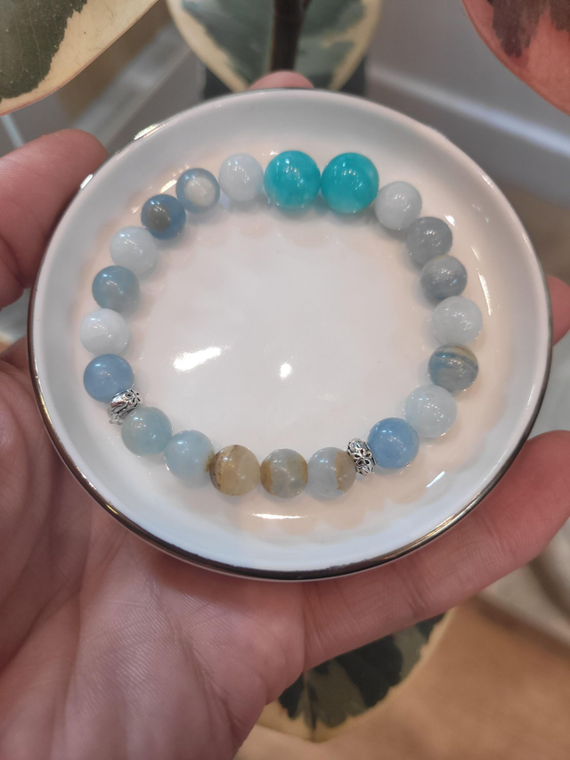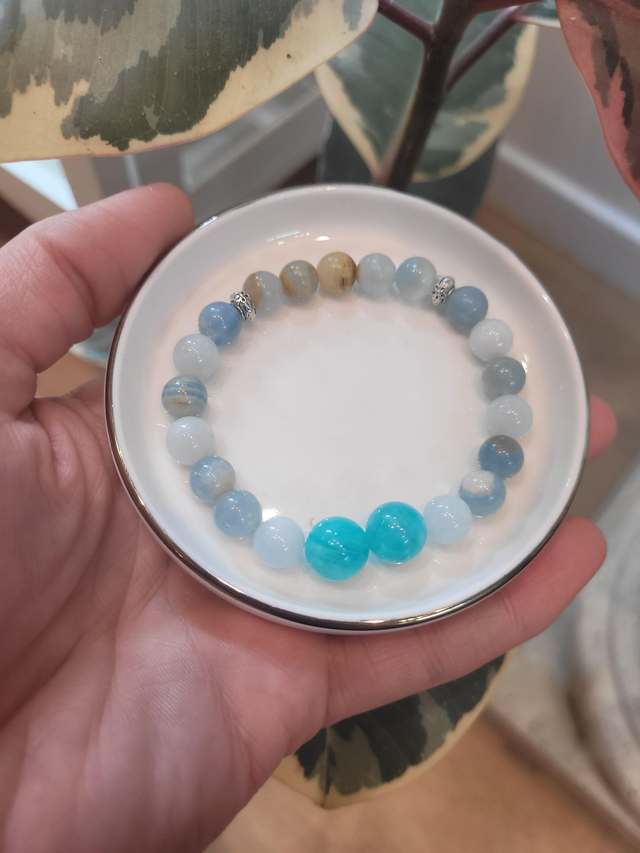 Ses pierres, choisies pour leurs nuances océanes et leur énergie fluide, évoquent le calme des profondeurs, la douceur du mouvement et la liberté intérieure.