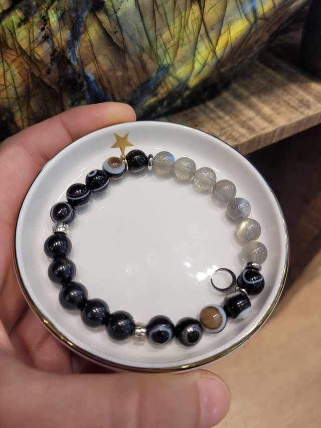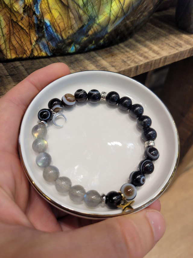 Entre clair et obscur, là où se rencontrent nos forces et nos fragilités, naît Ombres et lumières — un bracelet pensé comme un allié de transition. Ses pierres, choisies pour leur énergie de protection et de lucidité, évoquent le chemin qui traverse les zones d’ombre pour mieux révéler la lumière intérieure.